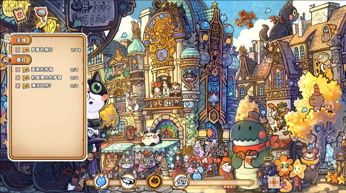 游戏融合了白日寻找魂片和暗夜追捕的玩法,白天可以悠闲地收集灵魂碎片,而夜晚则要参与充满挑战的追捕。收集和解谜并行,满足了收集控和解谜狂的双重需求。游戏内有丰富的任务和成就系统,玩家可以通过完成任务解锁新的故事和奖励,增加了游戏的重玩性。游戏中的每个场景都如同一幅精美的壁纸,带你走进蒸汽朋克的猫镇、星海鲸鱼岛、翡翠蘑菇林等奇幻世界。蒸汽朋克猫镇×星海鲸鱼岛×翡翠蘑菇林…每个场景都是壁纸级艺术品。