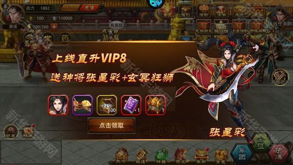 2、进入游戏后上线直升vip8送神将张星彩+玄冥狂狮