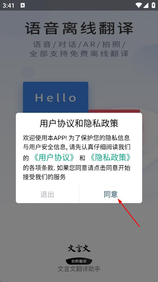 1、打开文言文翻译助手软件,弹出“用户协议和隐私政策”提示弹窗,阅读相关内容后,点击“同意”,进入文言文翻译助手主页面。