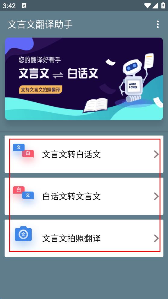 2、在文言文翻译助手主页面,根据需求选择翻译功能,比如“白话文转文言文”,进入对应的翻译输入页面。
