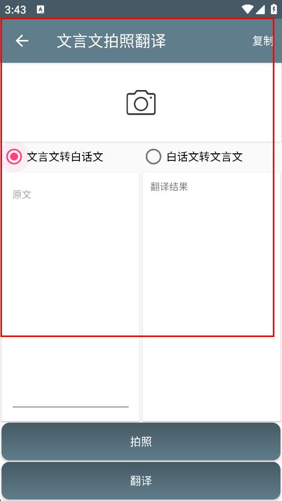 4、若选择“文言文拍照翻译”功能,进入文言文拍照翻译页面后,点击“拍照”按钮拍摄文言文内容,再点击“翻译”按钮,即可获取翻译结果。