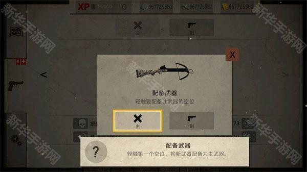 3、然后要配备新购买的武器,轻触“配备”按钮。轻触第一个空位,将新武器配备为主武器;