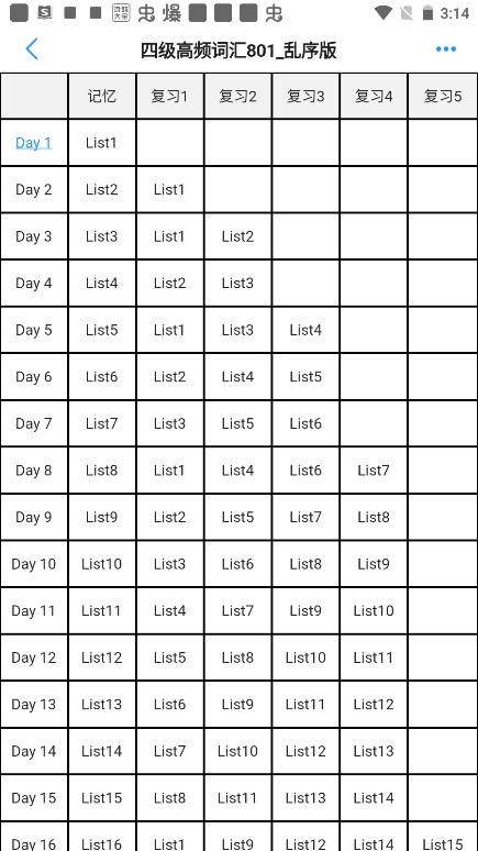 List背单词,根据艾宾浩斯的记忆规律来使用,初始一个Day记忆单词,后续的复习间隔周期为:`1`个Day,`2`个Days,`4`个Days,`7`个Days和`15`个Days,假设把单词词库平均分为`15`个list,在`30`个Days的时间里持续记忆和不断复习,由此制作了一份学习计划表。