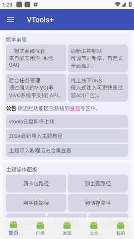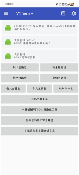 vtools+安卓版是一款很好用的主题修改器软件,通过自己软件用户只需要轻轻点击一键优化按钮就能更好的更改手机内的主题,获得更好的手机功能介绍的同时也能通过自定义手机的参数更改手机的主题。在这款软件之中每一位用户都可以更好的了解自己的手机功能,让每位用户都能享受其带来的便利与乐趣,使用起来高效且充满成就感,对这款软件感兴趣的玩家就来本站下载吧。