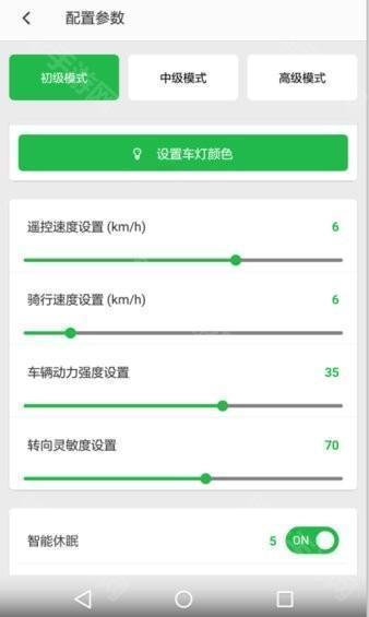 4.点击app界面的右上角设置,进入设置可以设置骑行模式、设置灯光颜色等。n1系列有三种骑行模式:初级模式专为儿童和初学者设计,中级模式更适合大众人群,高级模式适合熟练爱耍酷操作的老司机,个性化多功能让客户不断提升自己的驾驶体验。