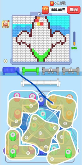【我要打毛线红包版】这是一款休闲益智类型的游戏,游戏由“类聚网络科技”公司出品,玩家将通过解锁和拼图的方式闯关,并且每次通关还能获得红包,游戏采用经典的淘汰游戏玩法作为基础,玩家需要将不同颜色的纱线缠绕在相应的柱子上以完成淘汰,或者将各种颜色的纱线存储在相应的卷轴上并填充其上的图案。游戏玩法简单随意,初学者可以快速上手,非常适合在摸鱼或零碎时间玩和体验。