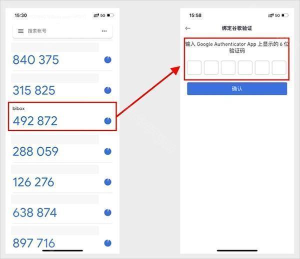 ②添加成功后,会显示6位数字及账号名 ;将生成的验证码输入至Bibox开启谷歌页面,即可绑定成功。