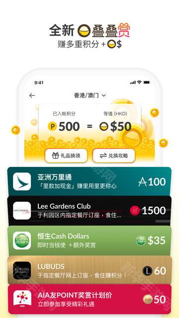 - 赚取多重会员积分(亚洲万里通、Lee Gardens Club、恒生Cash Dollars、LUBUDS)