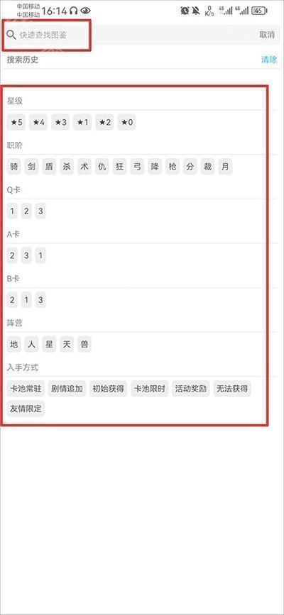 2、点击上方的快速查找图鉴后,可以在搜索框中输入你要查找的角色名称,也可以根据下方星级、职阶、Q卡、A卡等分类查找
