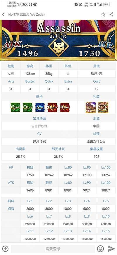 3、查找到指定角色图鉴后,点击进入可以查看到该角色的属性、配卡、礼装、宝具等各种详细信息