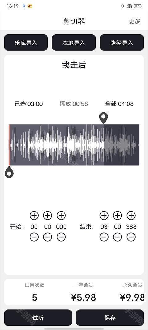 2、导入需要截取的音频,进行玩一番截取操作后点击保存。