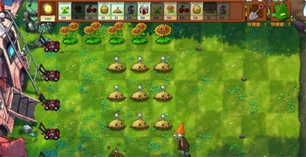 2、使用高于向日葵高度的坚果保护一路,其他路可以都种上“豌豆土豆雷”和“豌豆坚果墙”。