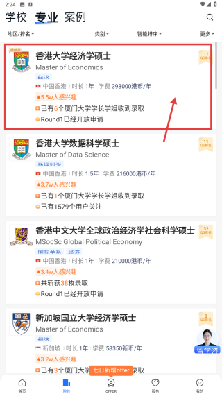 3、在专业详情页,点击香港大学经济学硕士的栏目条。