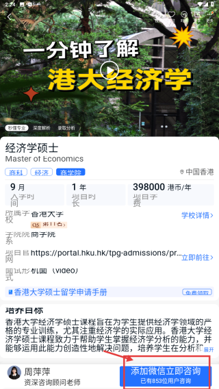 4、在专业详情页,点击添加微信立即咨询按钮,获取留学咨询服务。