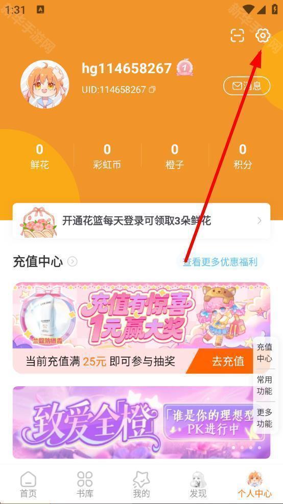 1、进入个人中心页面,点击右上角齿轮状的设置图标,进入设置界面。