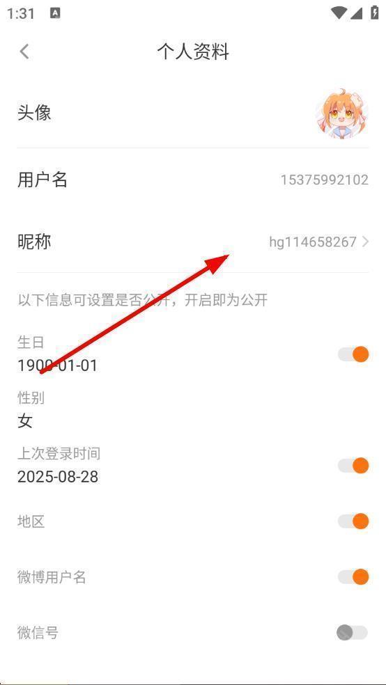 3、在个人资料页面里,点击昵称右侧箭头,即可修改昵称信息。