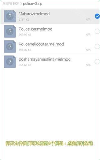 1、在第三方渠道下载好的模组,将文件使用“ES浏览器”打开,然后复制全部模组