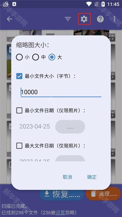 3、我们点击设置按钮,用户可以根据文件大小、日期等等进行照片的筛选,以便更好的恢复图片;