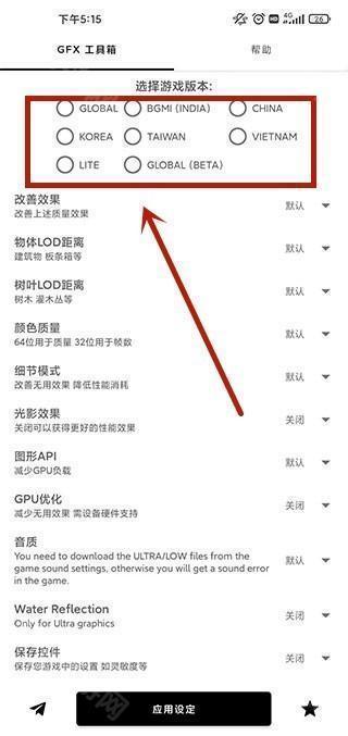 1、打开GFX工具箱app,点击最上方要修改的游戏版本(选择之后,圈起来的这个板块就会消失,如果想重新选择游戏版本,在后台结束软件的运行,再重新打开手机,即可重新选择)