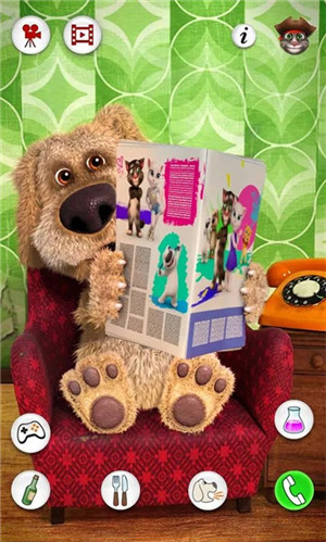 点击狗狗本右边的电话,电话就会想起来,狗狗本会拿起电话来听,这时候你可以跟它对话,狗狗本会很仔细的听你说话呢,还会重复你说的话哦,你想说什么它都可以听得到。