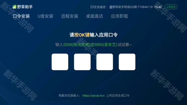 3.用户在野草官网分享软件后,可生成口令。智能电视端输入口令,即可一键安装。