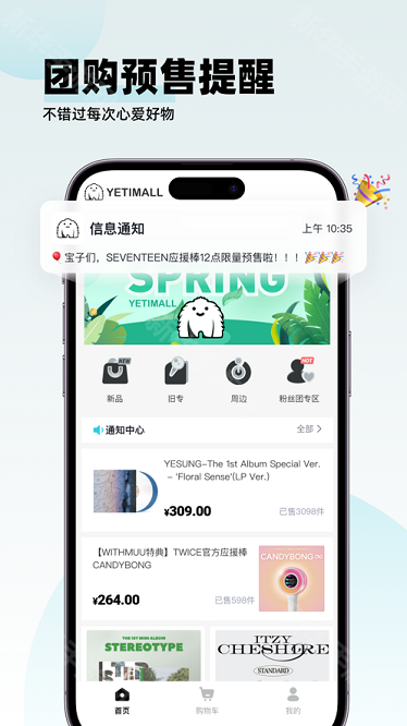 YETIMALL正版会定期举办各类优惠活动和抽奖活动,增加消费者的购物乐趣和获得实惠的机会。安全方便的购物体验,用户可以轻松浏览和购买爱豆周边商品,同时支持多种支付方式和快速配送服务。在这个软件当中所有的东西都是能够选购的,并且还能查看到具体的上架日期,新人还能够享受免费配送的服务。用户可以在平台上撰写对商品的评价和体验,帮助其他用户做出购买决策。