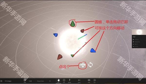 移动已经添加的物体。当你已经添加了许多物体之后,想要调节他们之间的距离和位置,在add按钮左侧有一个edit按钮,这就是移动物体位置的选项。选中一个你想要移动的物体鼠标左键拖动这个物体,就可以在平面内移动这个物体了。如果你想要调节这个星体的自转轴,单击拖动物体的自转轴就可以了