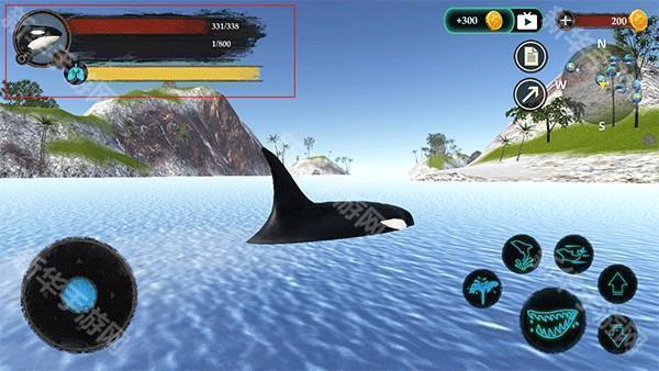 3、左边移动摇杆按钮可以操控虎鲸的行动,右边可以控制虎鲸的动作,比如喷水、跳跃、攻击等