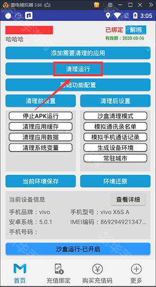 4、应用选择好后返回点击 清理运行 软件将自动清理设备注意事项:软件会默认清理系统文件信息,SD卡自动清空