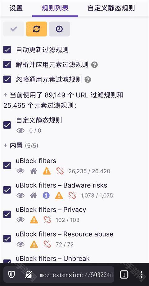 接下来我们添加uBlock Origin插件,安装之后在设置里边,规则列表中更新一下规则。