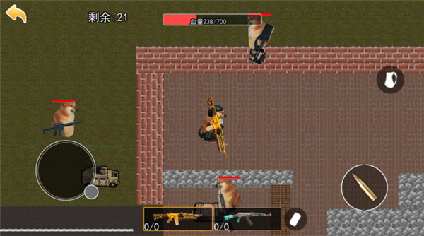 2.控制狗狗和机甲进行移动和射击,避开障碍物,拿起武器和补给。