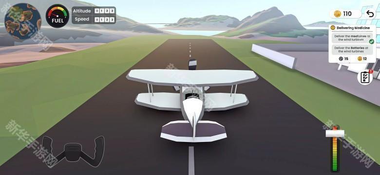 进入飞行模式,驾驶组装好的飞机在跑道上准备起飞,界面显示燃油、高度、速度等关键数据,右侧任务栏提示需完成的物资运输任务(如运送药品、电池到风力发电机站点)。
