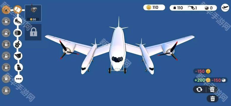进入组装界面,可选择不同的飞机部件(如引擎、机翼等)进行拼装,界面左侧显示可解锁的部件,右上角显示金币等资源,通过合理组装打造性能各异的飞机。