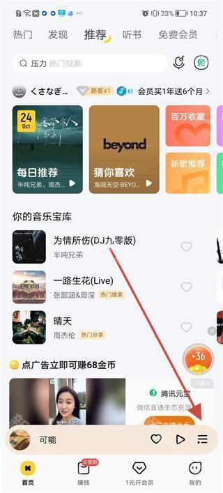 1、打开酷我音乐app,进入首页可查看每日推荐、猜你喜欢等音乐板块,也可查看自己的音乐库,如为情所伤、一路生花等歌曲,点击播放按钮收听音乐。