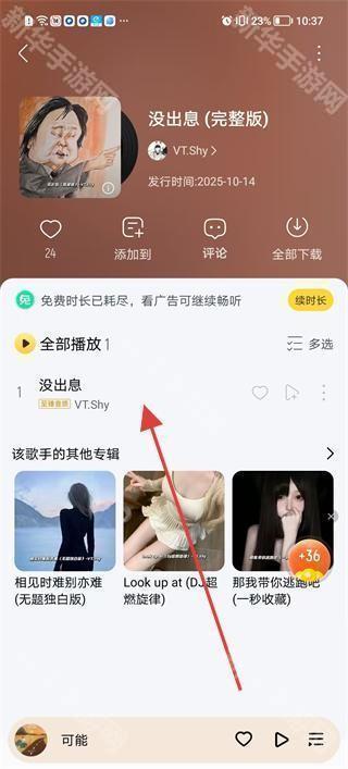 4、进入歌曲详情页面可查看歌曲的发行时间、专辑信息等,也可对歌曲进行收藏、添加到歌单、评论等操作,享受个性化的音乐收听体验。