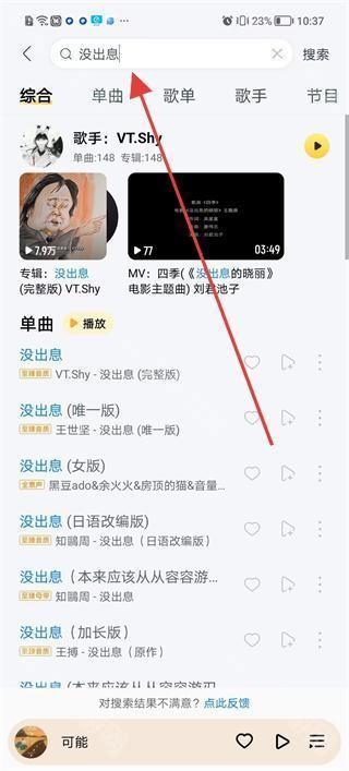 3、在搜索栏输入歌曲名称如没出息,可查看综合、单曲、歌单等分类的搜索结果,选择心仪的歌曲进行播放。