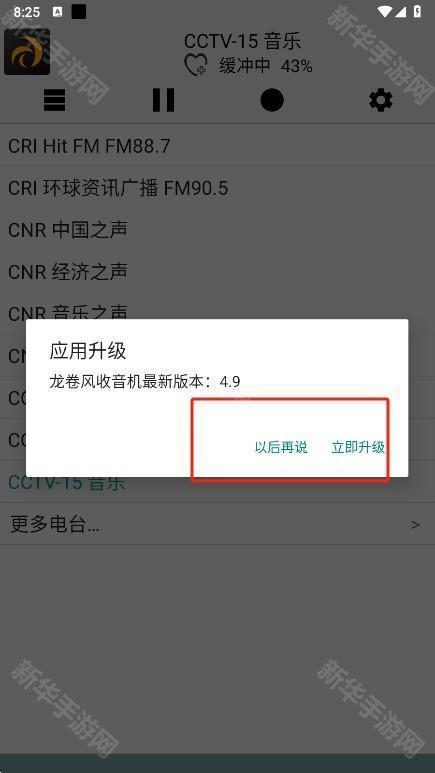 1、在本站下载安装龙卷风收音机打开,会提升内部升级4.9,大家不要升级,点击以后再说,不然会闪退
