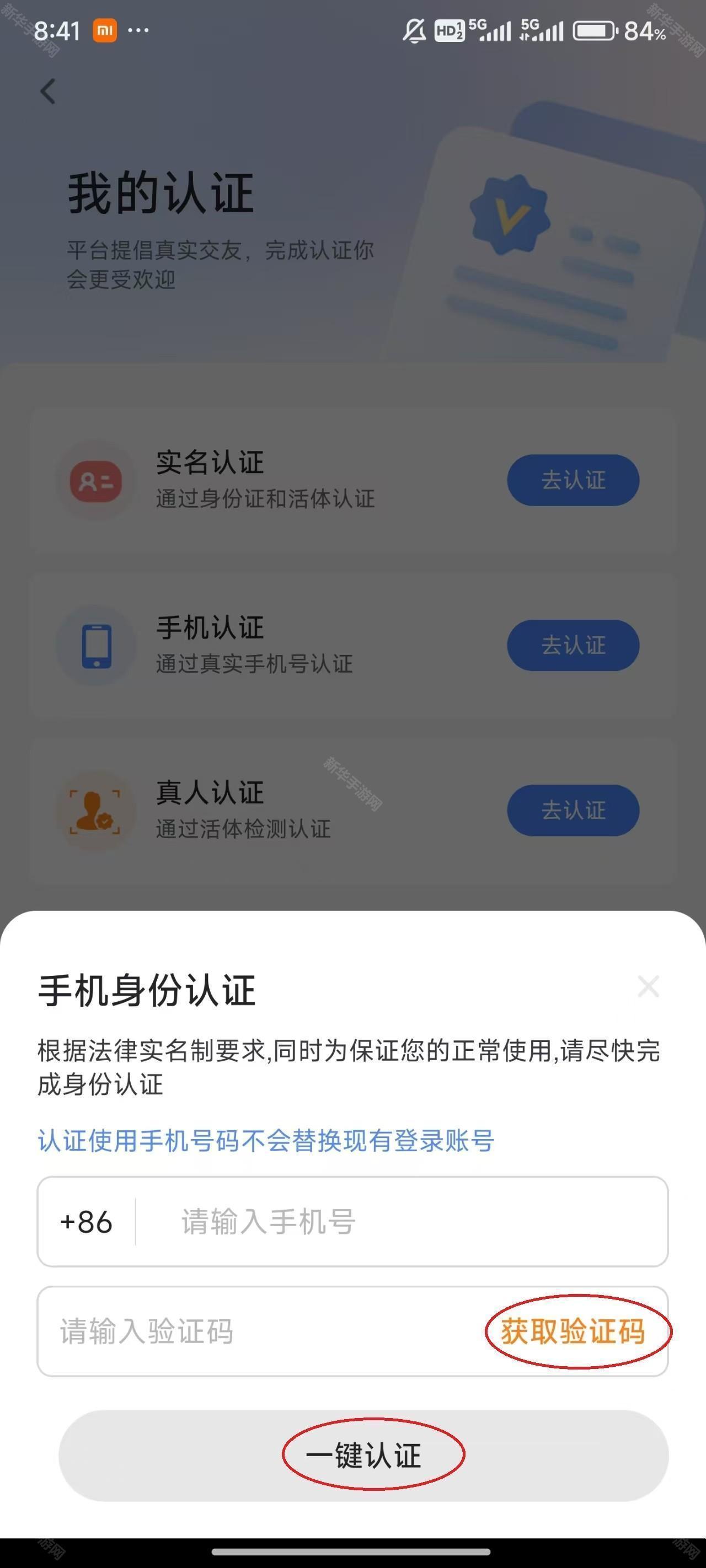 5、手机认证,输入手机号,点击“获取验证码”,输入验证码后,点击屏幕下方的“一键认证”。