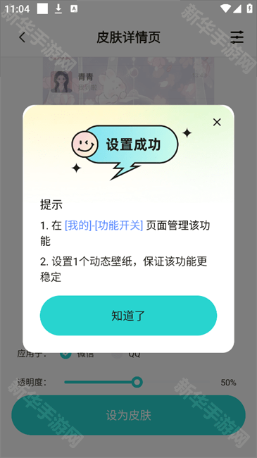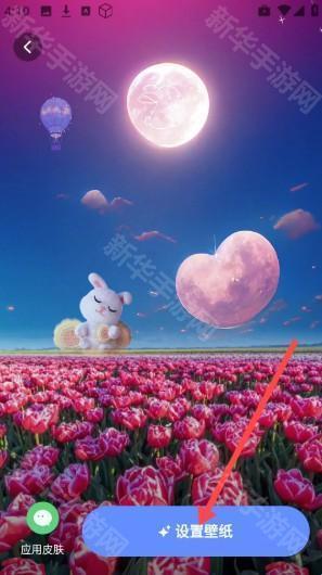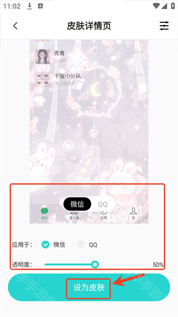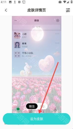 2.“应用皮肤”可以直接把当前主题设置为微信或是QQ背景;点击“设置壁纸”可直接将壁纸应用到手机背景当中