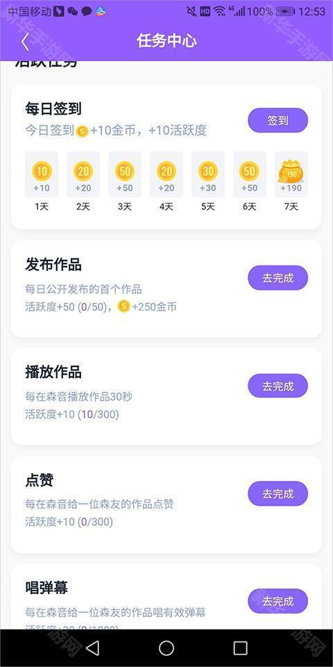 在打开的新页面中可以通过签到、发布作品、点赞等方式,完成对应任务获取金币,金币到了一定值时可以换钻石了