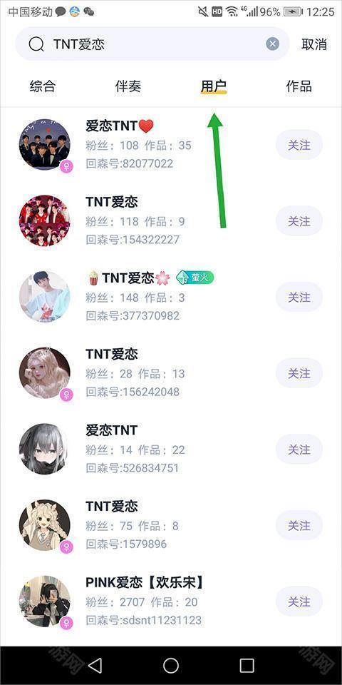 在打开的搜索结果页面中,将页面切换至【用户】处(下图绿色箭头所指),选择森友进行关注即可