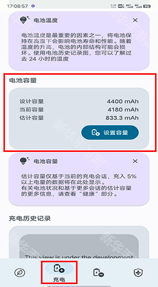 2、点击下方菜单栏中的“充电”按钮进入,在当前页面下滑找到电池容量即可查看电池出厂容量和预估容量(电池寿命);