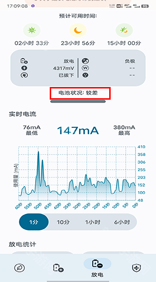 3、另外你还可以在“放电”页面查看电池状况及实时电流输出;