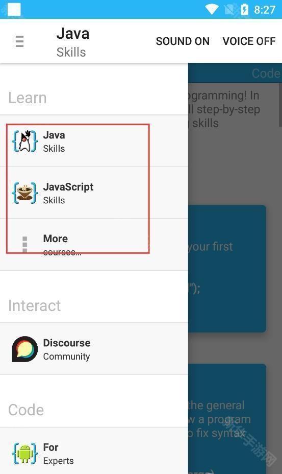 1、编程学习APP侧边栏,列JavaJavaScript技能学习入口可展开选课程。