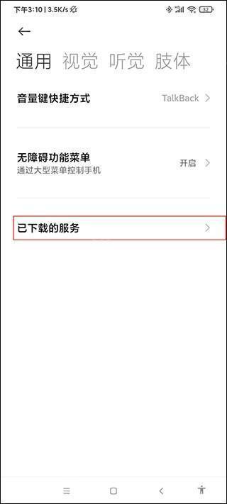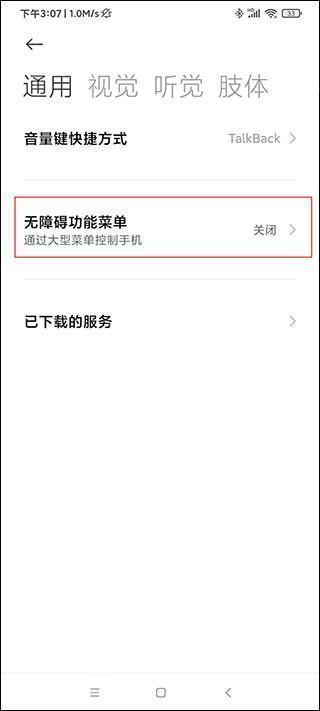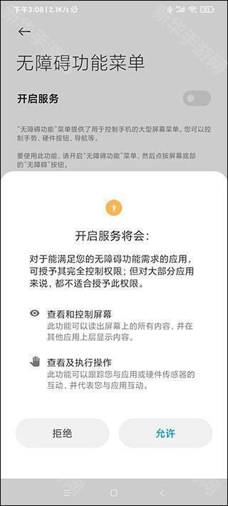 2、点击“辅助功能权限”后,找到“无障碍功能菜单”,是默认关闭的,需要开启。
