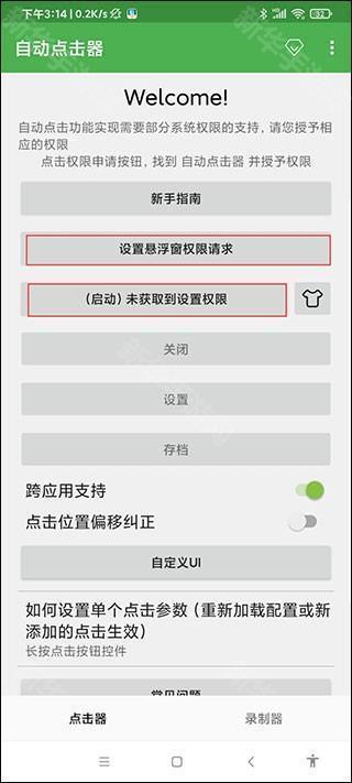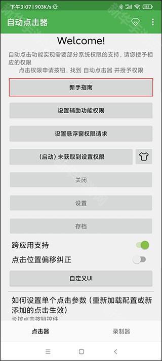 1、打开自动连点器,在首页这里有“新手指南”,可以查看使用指引;使用时首先要点击“设置辅助功能权限”。