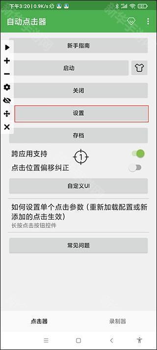 9、可以看到旁边出来了一条功能悬浮框(开始暂停键、增加点击任务、增加滑屏任务、减少点击任务、影藏任务点、关闭任务栏),接下来点击设置。