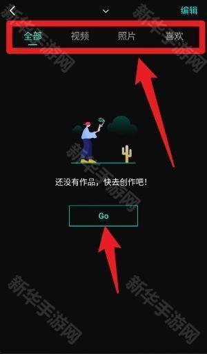 5、在作品管理页面,用户可通过全部、视频等分类快速查找和管理拍摄内容,点击Go即可开始新的创作。