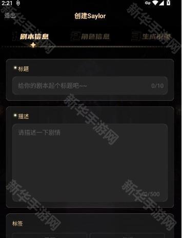 2.在创建界面,首先输入剧本标题、描述和标签,APP会根据关键词自动生成剧本信息