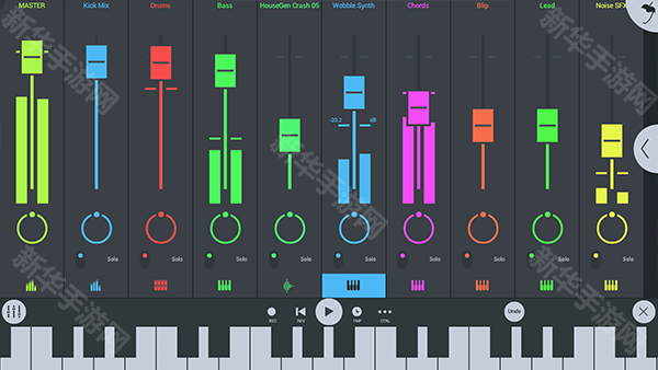 10、混音器:每轨静音、独奏、效果总线、声像和音量调节。